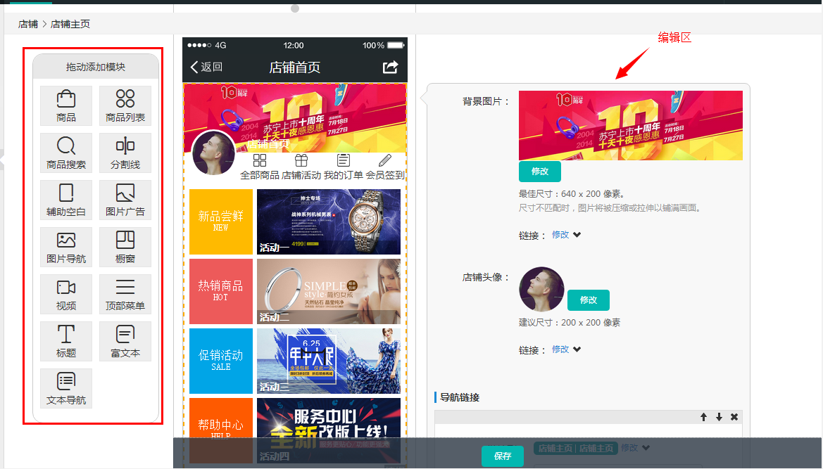 店鋪主頁中所有添加的模塊可以自由編輯添加或者刪除,上下移動位置等。