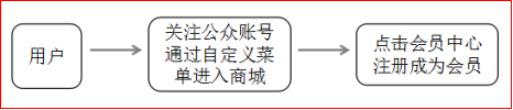 ①、用戶關(guān)注公眾賬號后,通過自定義菜單進入商城。