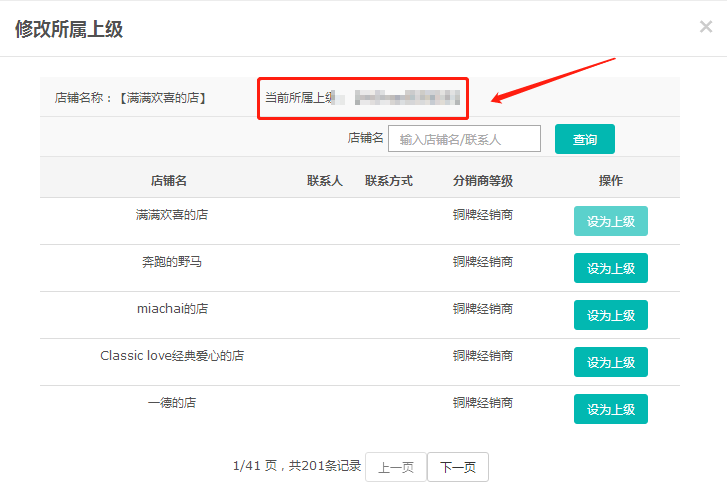 第二步,輸入需要調(diào)整到分銷店鋪的名稱點擊查詢,點擊此分銷店鋪設(shè)為上級即可