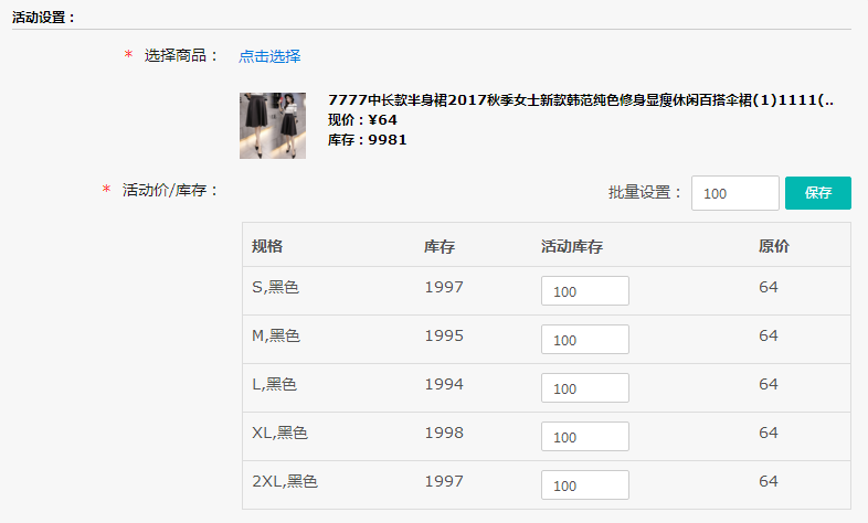 活動(dòng)價(jià)/庫存:設(shè)置參加活動(dòng)商品的庫存和價(jià)格,庫存為獨(dú)立庫存,不占用微商城的庫存,請(qǐng)根據(jù)自己的實(shí)際情況合理設(shè)置庫存。價(jià)格一般設(shè)置為低于商品不設(shè)置營(yíng)銷活動(dòng)的售價(jià),
