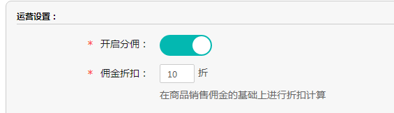 ‚如開啟參與分傭功能,商家根據(jù)自身運(yùn)營(yíng)情況判別是否需要對(duì)傭金折扣發(fā)放,假如傭金原本設(shè)置是10%,想讓傭金折扣變成分銷商可拿5%的傭金,則在傭金折扣填寫5折,填寫10折表示傭金還是10%。