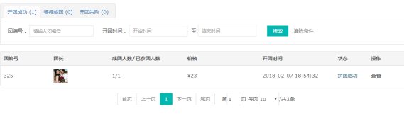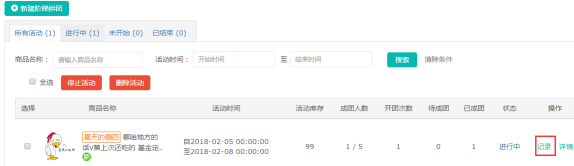 記錄:點(diǎn)擊記錄可以查看拼團(tuán)成功/等待成團(tuán)/開團(tuán)失敗不同狀態(tài)的團(tuán)。