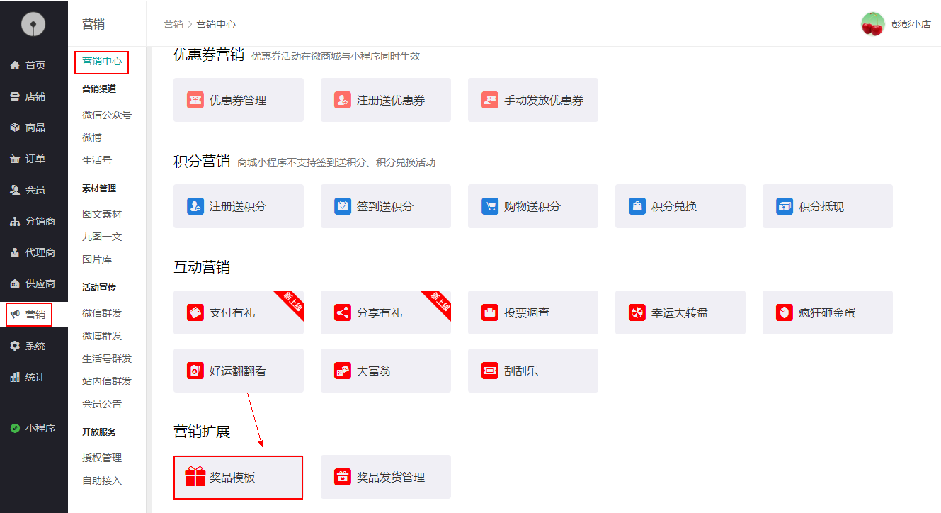 第一步,新建獎品模板,在營銷-營銷中心-營銷擴(kuò)展中創(chuàng)建