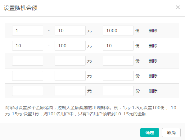 設(shè)置隨機(jī)金額:如設(shè)置1-10元設(shè)置1000份,10-100元設(shè)置大紅包10份,則有1010位用戶可領(lǐng)取到紅包,設(shè)置紅包最多是5個階梯