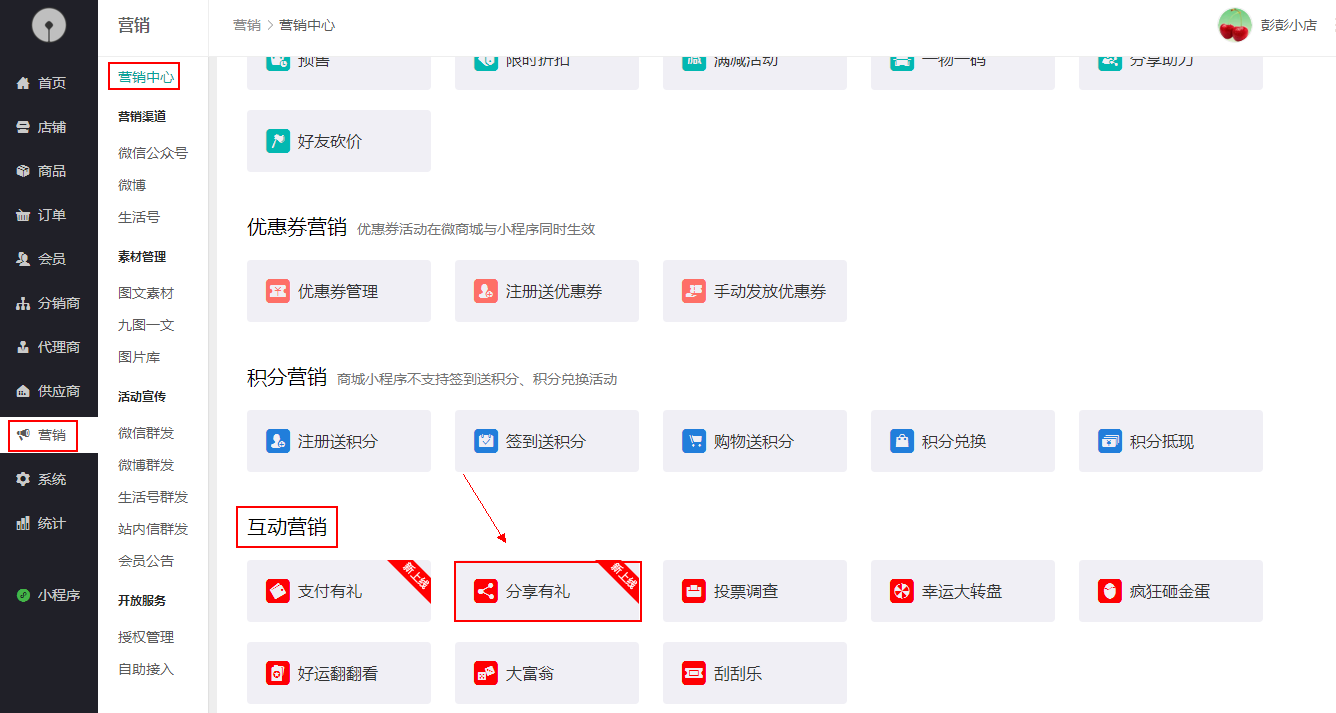 第五步,創(chuàng)建分享有禮活動,在營銷-營銷中心-互動營銷中心點擊分享有禮創(chuàng)建