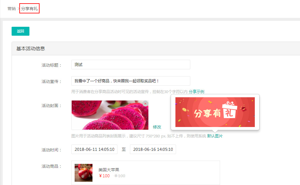 活動封面:尺寸最好 750*280,假如沒有上傳活動封面則會自動使用系統(tǒng)默認(rèn)圖片(上圖中分享有禮的圖片);