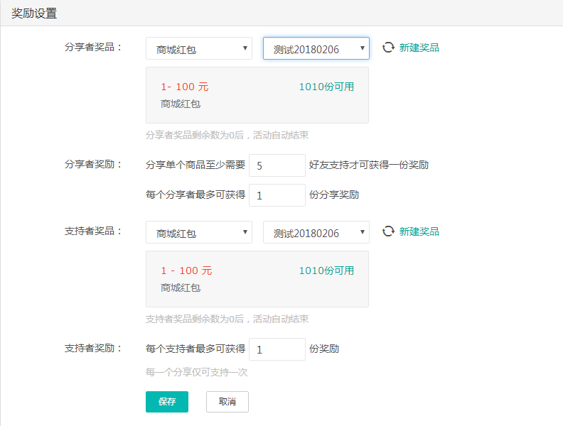 分享者獎品:選擇之前創(chuàng)建好的商城紅包,如商城紅包獎品數(shù)為0時即活動結(jié)束,即使活動時間沒有結(jié)束,如設(shè)置好的活動時間結(jié)束了獎品數(shù)還沒發(fā)完活動也結(jié)束;