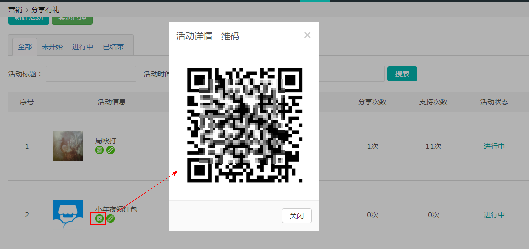 1)點擊下圖標(biāo)記處即可彈出活動的二維碼,活動二維碼可自己掃后分享到朋友圈或好友,也可以將二維碼傳播到其他途徑宣傳;