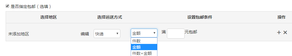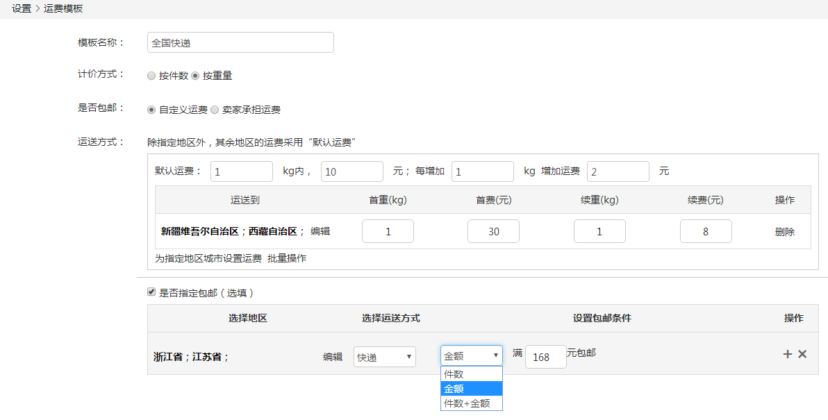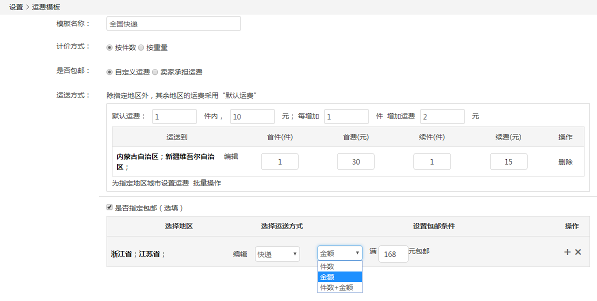 【設(shè)置包郵條件】件數(shù)、金額、件數(shù)+金額三選一,輸入對(duì)應(yīng)條件,如選擇金額,則可輸入滿168元包郵。