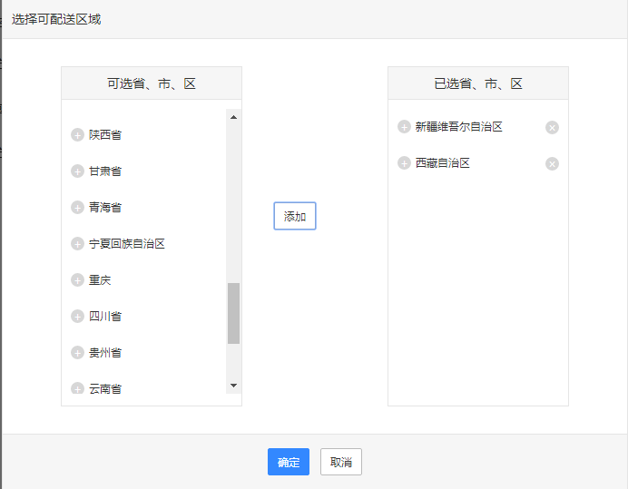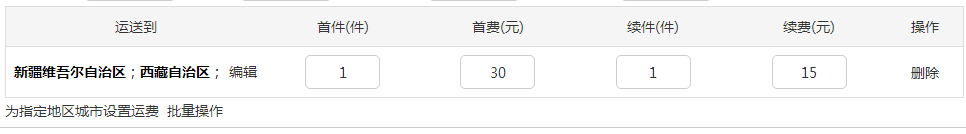 b、為指定地區(qū)城市設(shè)置運(yùn)費(fèi):如新疆、西藏等偏遠(yuǎn)地區(qū)郵費(fèi)偏高,則點(diǎn)擊編輯即彈出上圖,選擇新疆、西藏即可,然后將編輯郵費(fèi)