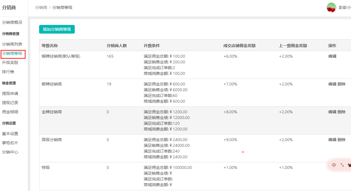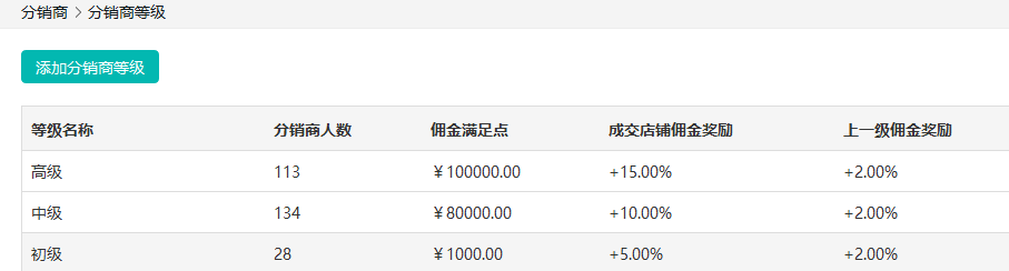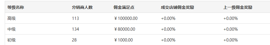 當(dāng)商品中設(shè)置的傭金其中有一個(gè)為0的情況下,分銷商等級(jí)也設(shè)置了對(duì)應(yīng)的傭金比例。如下圖:
