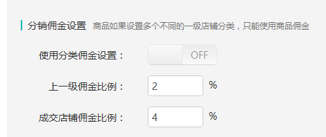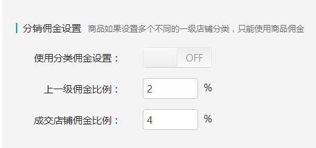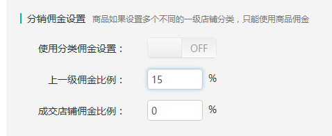 這里關(guān)閉,不是關(guān)閉下面的傭金設(shè)置的狀態(tài),是不讀取“分類的傭金設(shè)置”。也就是說(shuō)開(kāi)啟了就會(huì)讀取分類里面設(shè)置的分類傭金,關(guān)閉了就是直接在這里設(shè)置傭金即可。)