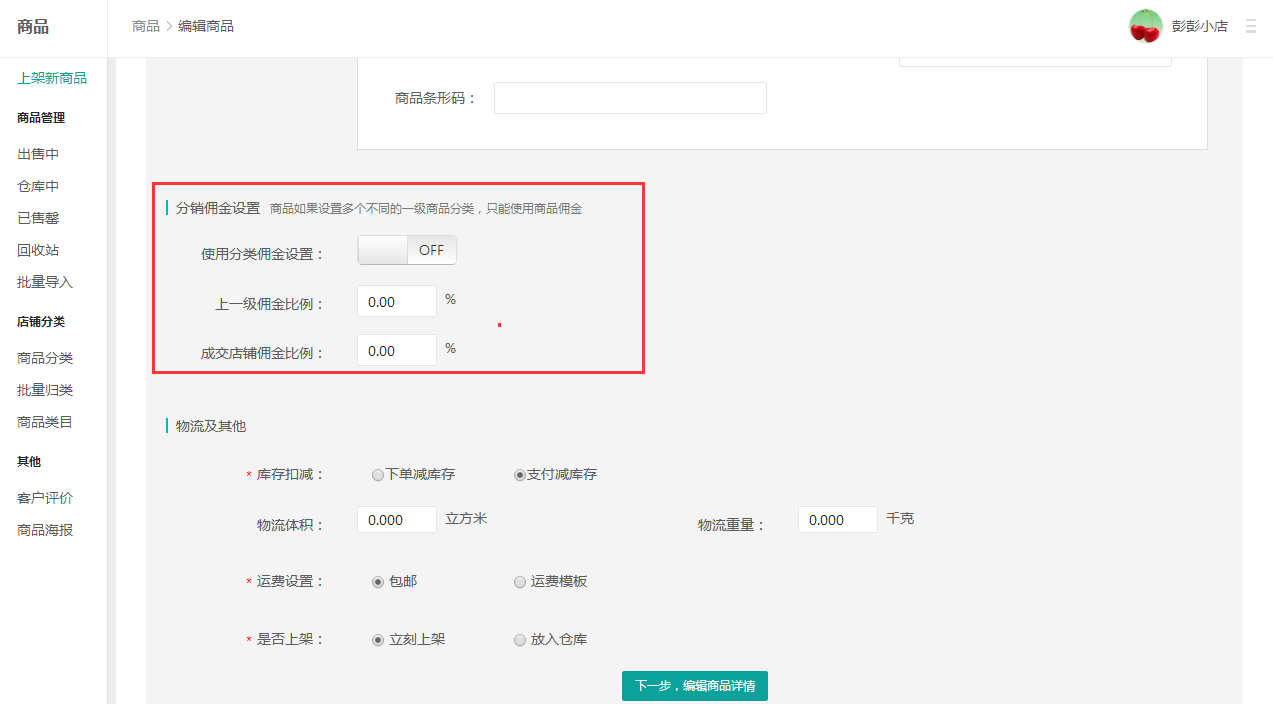 但是同一個(gè)分類下面,商品利潤(rùn)也會(huì)有所不同。所以當(dāng)一個(gè)分類下商品利潤(rùn)不同時(shí),可以再針對(duì)這個(gè)商品設(shè)置傭金比例。