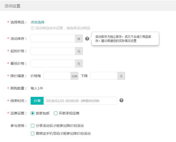 降價(jià)幅度:每隔多少分鐘可自動(dòng)降價(jià)多少元,如設(shè)置每10分鐘降價(jià)10元,則系統(tǒng)會(huì)自動(dòng)在活動(dòng)開始后每10分鐘就降10元。