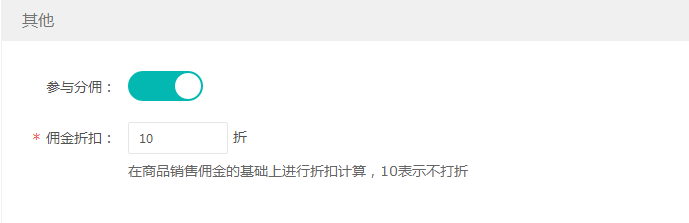 2.如開啟參與分傭功能,商家根據(jù)自身運(yùn)營(yíng)情況判別是否需要對(duì)傭金折扣發(fā)放,假如傭金原本設(shè)置是10%,想讓傭金折扣變成分銷商可拿5%的傭金,則在傭金折扣填寫5折,填寫10折表示傭金還是10%。