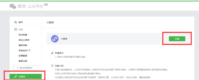 點擊“開通”按鈕----點擊“快速注冊并認證小程序”