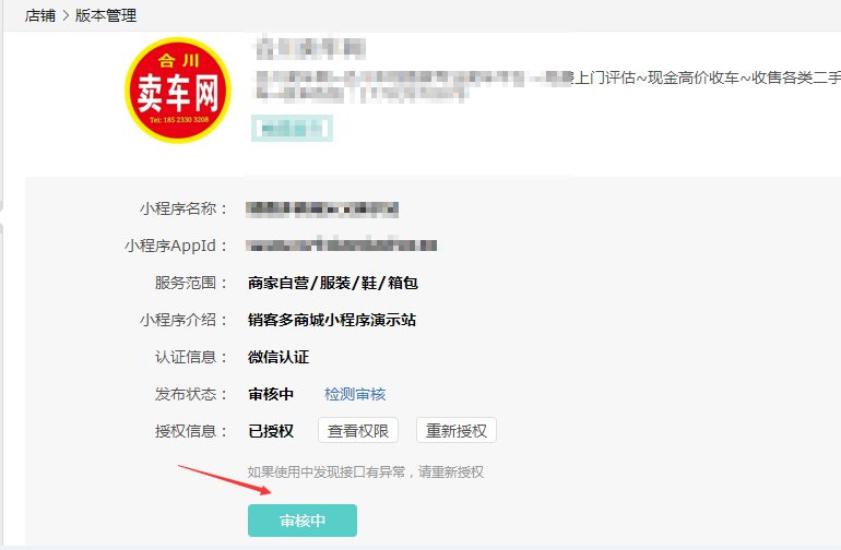 點擊“上傳提審”小程序的發(fā)布狀態(tài)變成“審核中” 代碼上傳后需5-7天時間審核,審核是否通過小程序綁定的微信管理員微信會接收到相關的消息提醒。