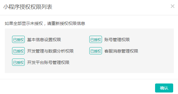 ƒ查看權(quán)限:授權(quán)后點擊查看權(quán)限查看小程序授予安菲云平臺的權(quán)限,權(quán)限前面顯示已授權(quán)代表授權(quán)成功,如果權(quán)限前面顯示未授權(quán)則代表小程序沒授予安菲云平臺該權(quán)限;如果全部顯示未授權(quán),請重新授權(quán)授權(quán)信息