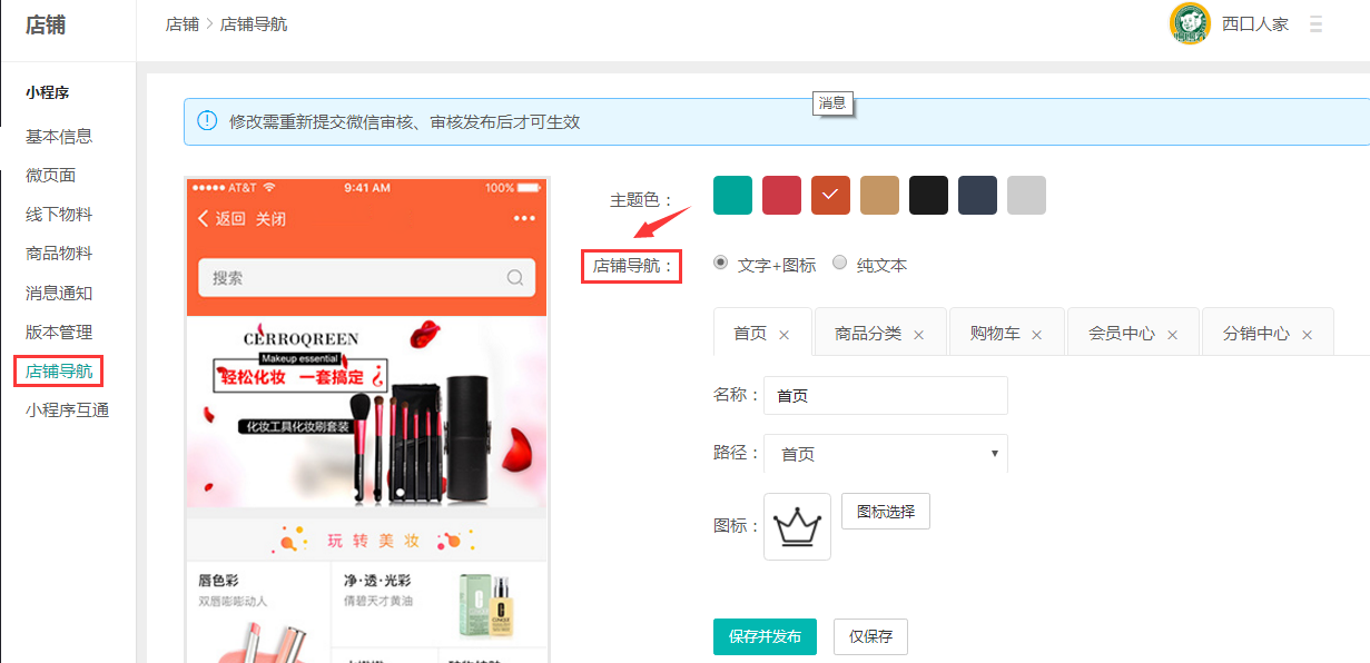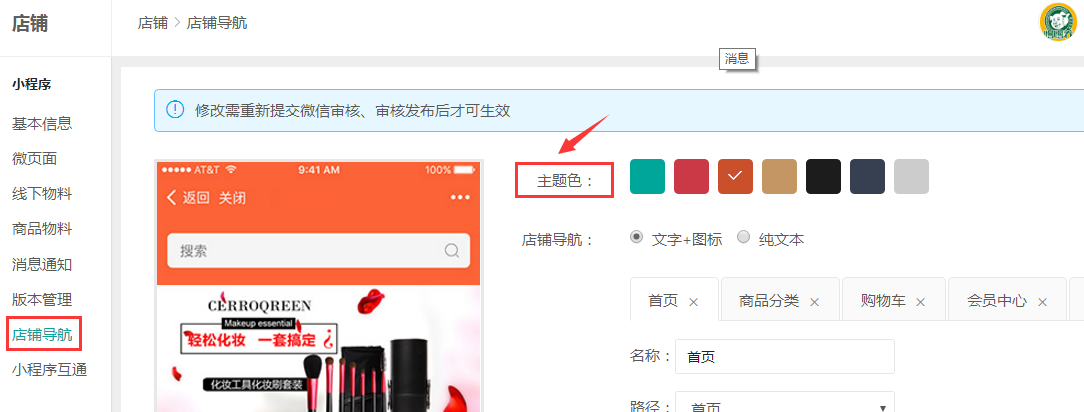 1、注意:修改小程序的店鋪導航需要重新上傳代碼到騰訊去審核,審核通過以后才可以發(fā)布最新編輯的導航