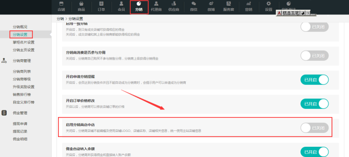 解決方法:在分銷模塊--分銷設(shè)置--啟用分銷商店中店--開啟