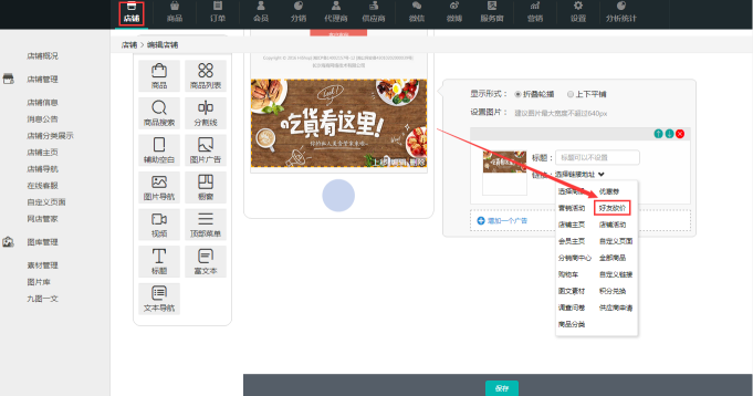 解決方法1:店鋪活動(dòng)中是不包含好友砍價(jià),但我們可以在店鋪主頁(yè)編輯時(shí),選擇加一個(gè)廣告圖,或者加小標(biāo),圖片導(dǎo)航等