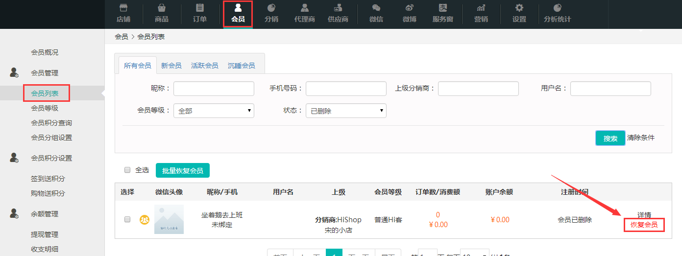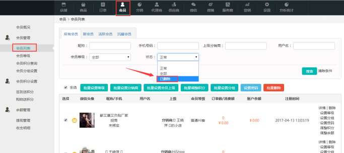 會(huì)員--->會(huì)員列表--->選擇“已刪除” 點(diǎn)擊搜索
