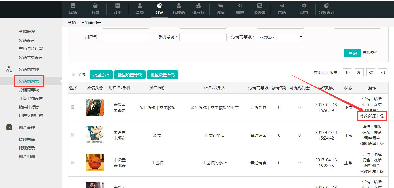 6、代理商的上下級(jí)不可以手動(dòng)修改,分銷商的上下級(jí)可以由商家修改。