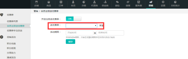 這里一定要注意的是注冊(cè)送優(yōu)惠券是要選擇活動(dòng)贈(zèng)送喔,不是自動(dòng)領(lǐng)取 沒有選對(duì)的話,會(huì)發(fā)現(xiàn)這里沒有可選優(yōu)惠券