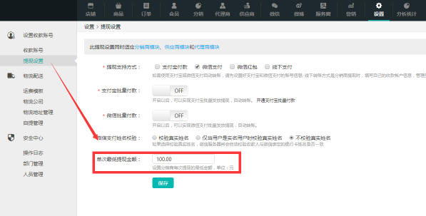 62 分銷商要提現(xiàn),我不想他們次一塊錢一塊錢的來(lái)設(shè)置,想直接設(shè)置單次提現(xiàn)金額50或100這樣的,后臺(tái)可以設(shè)置嗎?