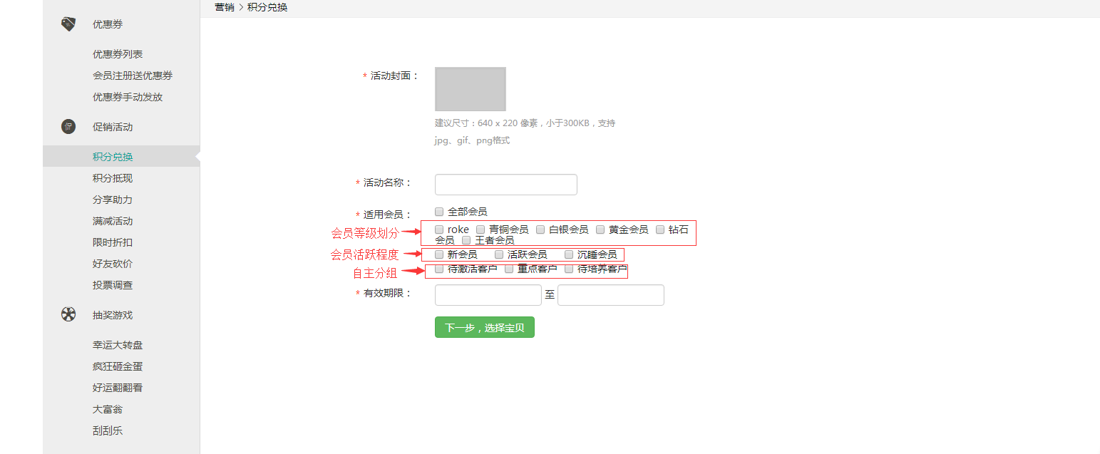 ② 填寫(xiě)活動(dòng)信息,首先添加活動(dòng)封面,這個(gè)就需要商家自己網(wǎng)上找或制作(注意圖片的尺寸和格式哦);然后填寫(xiě)活動(dòng)名稱,這個(gè)也由商家自己設(shè)置;接下來(lái)選擇活動(dòng)參與會(huì)員范圍,商家會(huì)員會(huì)有三個(gè)維度的劃分,商家需要在目標(biāo)會(huì)員前進(jìn)行勾選;最后需要設(shè)置活動(dòng)有效期,即活動(dòng)時(shí)間。