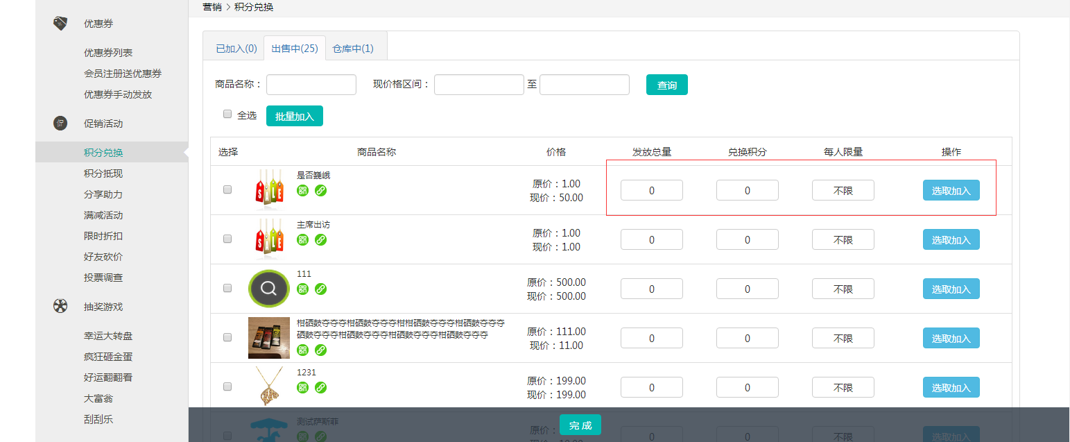 ③ 設(shè)置完活動(dòng)的基本信息,商家需要選擇活動(dòng)的商品范圍,首先設(shè)置積分兌換商品的發(fā)放總量,第二步設(shè)置該商品兌換需要的積分,第三步就是設(shè)置每人可領(lǐng)取的數(shù)量,默認(rèn)是每人限領(lǐng)一份,商家也可以自行設(shè)置,最后點(diǎn)擊“選取加入”的按鈕,該商品就設(shè)置完成了,設(shè)置完所有商品記得點(diǎn)擊下方的“完成”按鈕,到這里整個(gè)積分兌換活動(dòng)就算設(shè)置成功了。
