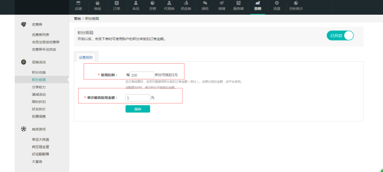 ② 設置積分兌換規(guī)則,商家根據積分獲取的難易程度設置抵現比例,單次最高抵現金額的設置避免了用戶一次性使用完所有積分,增加會員黏性。設置完后記得保存哦。