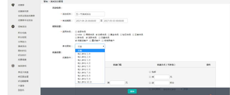 ② 填寫活動的基本信息,包括設(shè)置活動名稱、選擇活動有效期、選擇會員范圍以及設(shè)置參與限制,參與限制這一欄為非必填項,默認(rèn)為不限,如果商家有特殊要求,可以限制參與次數(shù)。