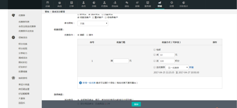 ③ 選擇優(yōu)惠設(shè)置,這里主要分為兩種“滿減方式”,一種是滿額優(yōu)惠,即用戶訂單金額達(dá)到設(shè)定金額即可獲得優(yōu)惠,另一種是滿件優(yōu)惠,即用戶訂單中的商品達(dá)到設(shè)置的件數(shù)就能享受優(yōu)惠。優(yōu)惠分為包郵、減免金額、贈送積分以及贈送優(yōu)惠券四種形式。