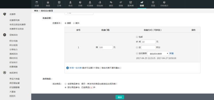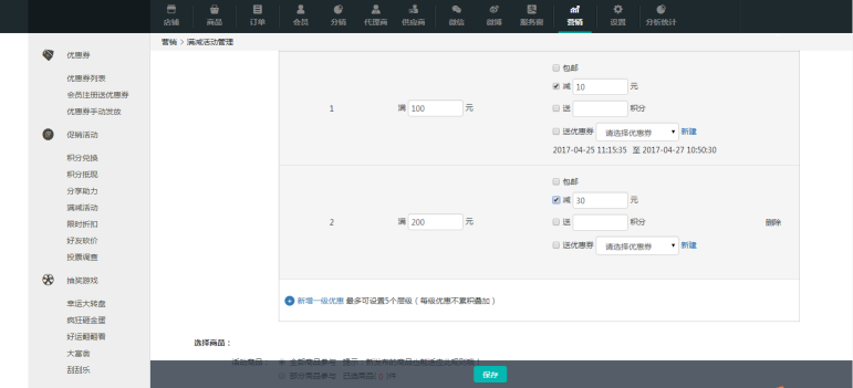 ④ 設(shè)置多級優(yōu)惠,舉個簡單的例子,商家推出“滿100減10,滿200減30活動”,其中的“滿100減10”屬于一級優(yōu)惠,“滿200減30”屬于二級優(yōu)惠,商家最多可設(shè)置五級優(yōu)惠。