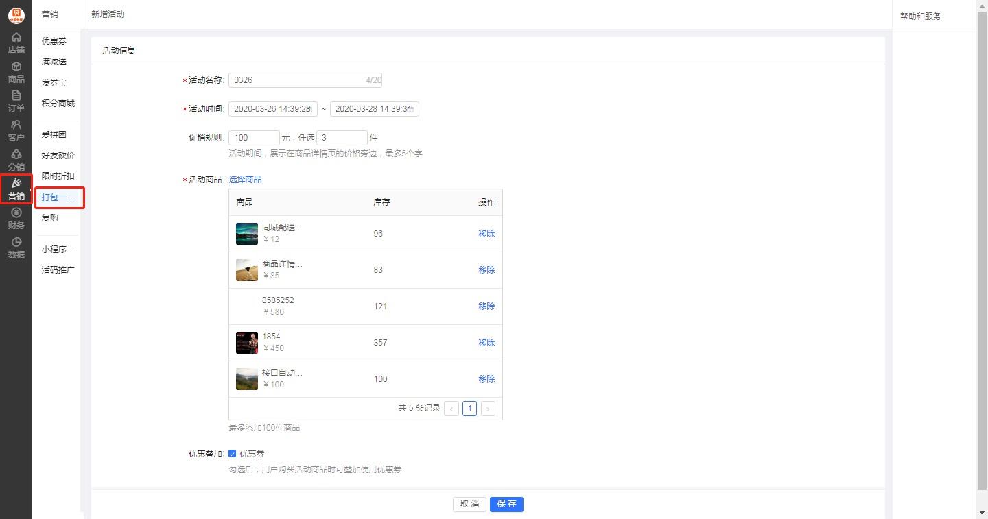第一步、進入管理后臺營銷版塊,選擇打包一口,點擊新建活動
