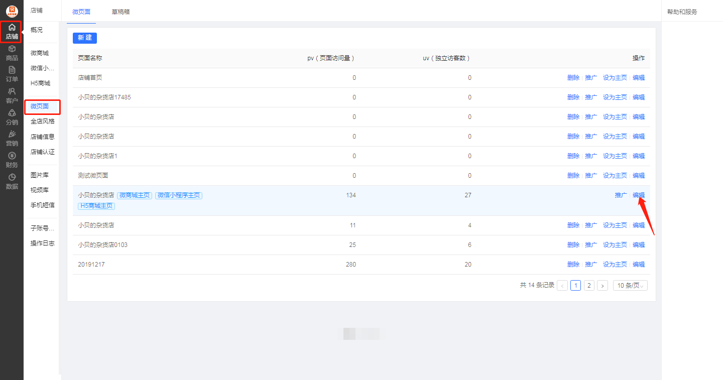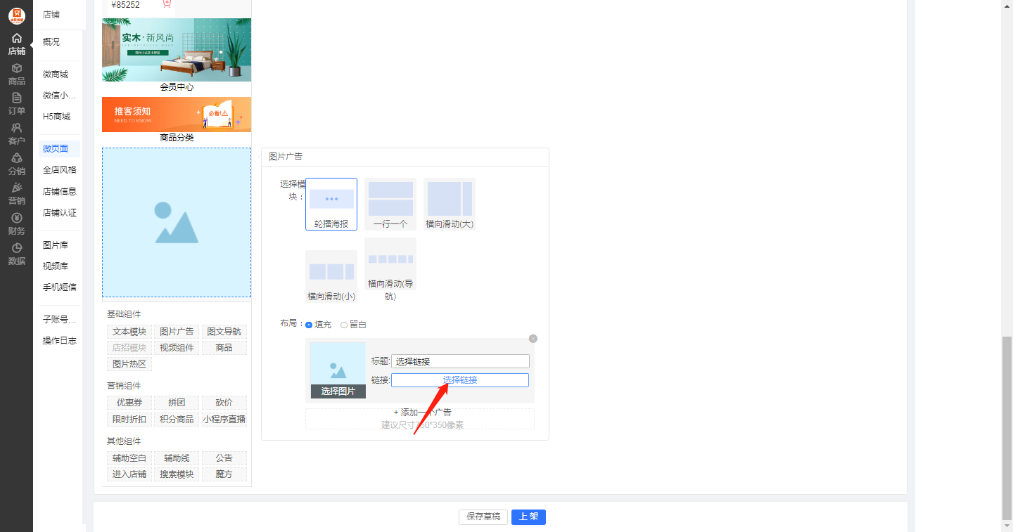 進入店鋪菜單,選擇微頁面,比如我們可以設置在首頁設置一個活動入口,點擊主頁編輯,選擇一個位置即可(編輯流程是可視化的,可以預覽設置后的效果)設置好活動鏈接