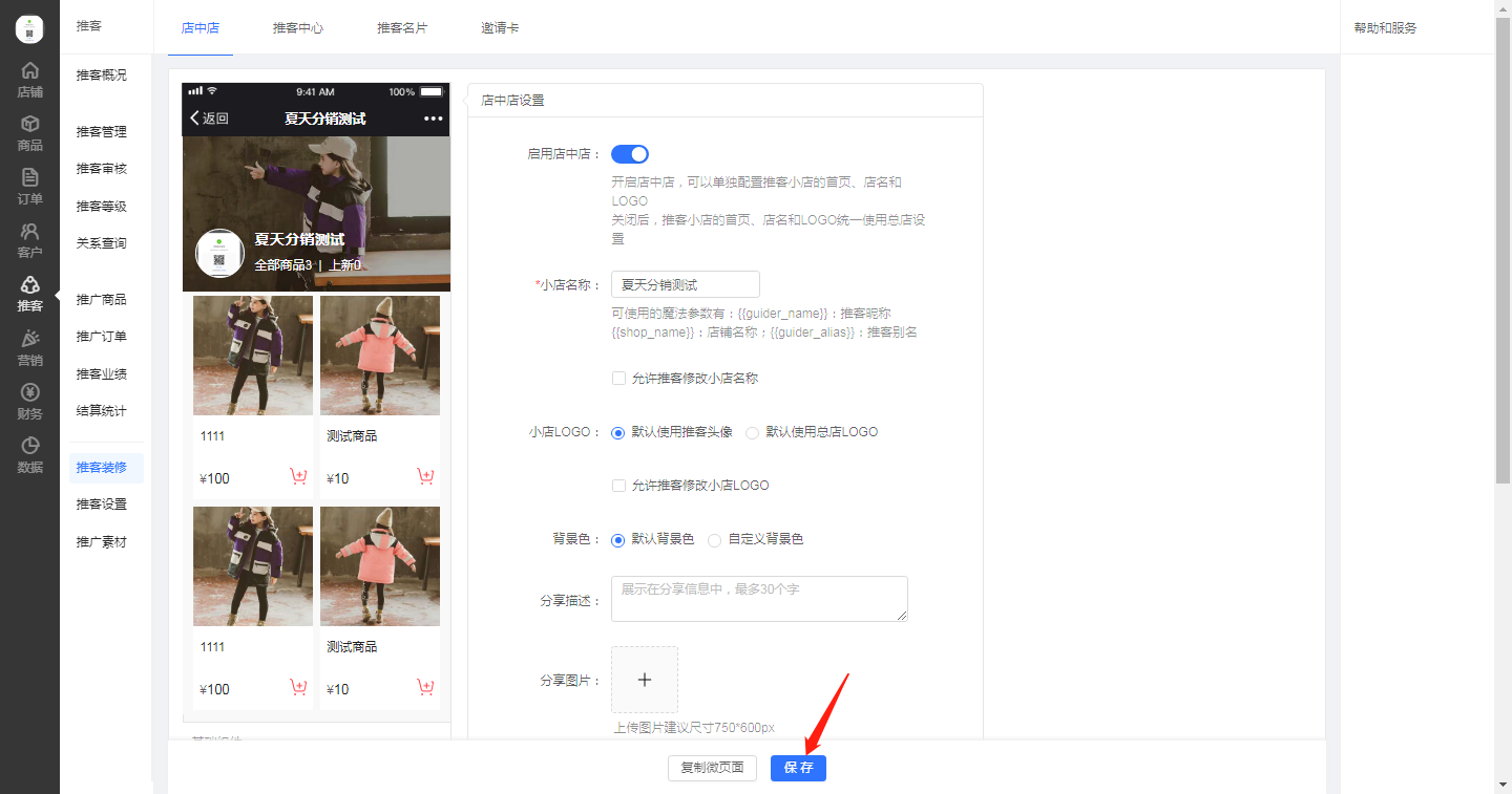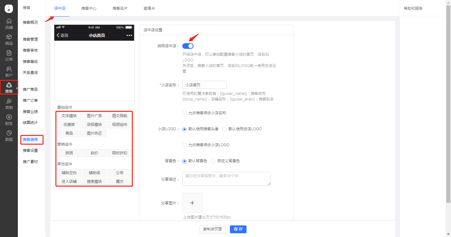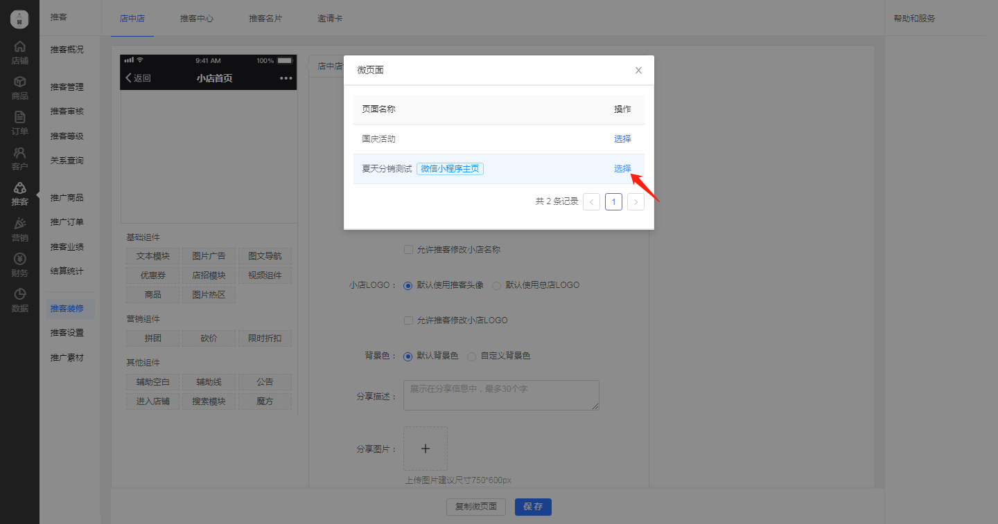 打開(kāi)后臺(tái)推客??欤c(diǎn)擊推客裝修,啟用店中店,復(fù)制微頁(yè)面,選擇頁(yè)面,然后保存即可