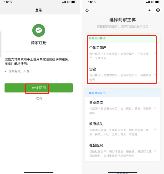 再點(diǎn)擊立即成為商家,開始申請(qǐng),允許使用,選擇商家主體,一般商家開店是企業(yè)或者個(gè)體工商戶