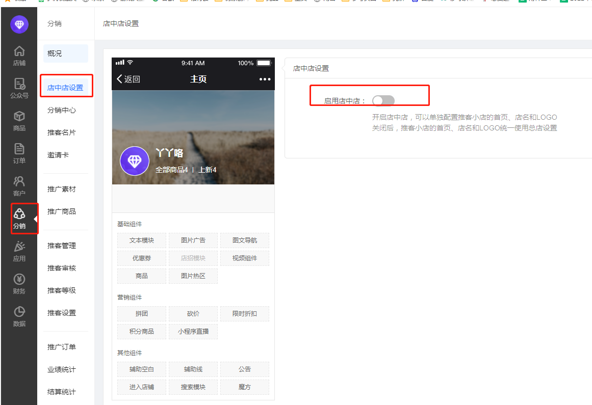 商家可以進(jìn)入管理后臺(tái)【分銷(xiāo)】版塊-打開(kāi)【店中店設(shè)置】--點(diǎn)擊開(kāi)啟