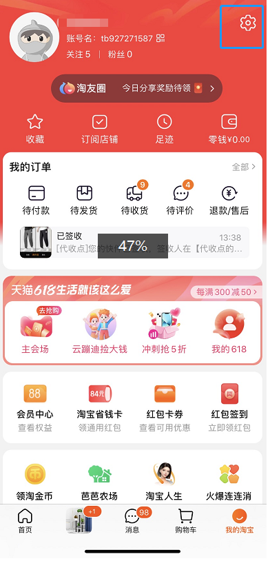 第一步:打開手機(jī)淘寶app,點(diǎn)擊我的淘寶,點(diǎn)擊右上角的設(shè)置按鈕
