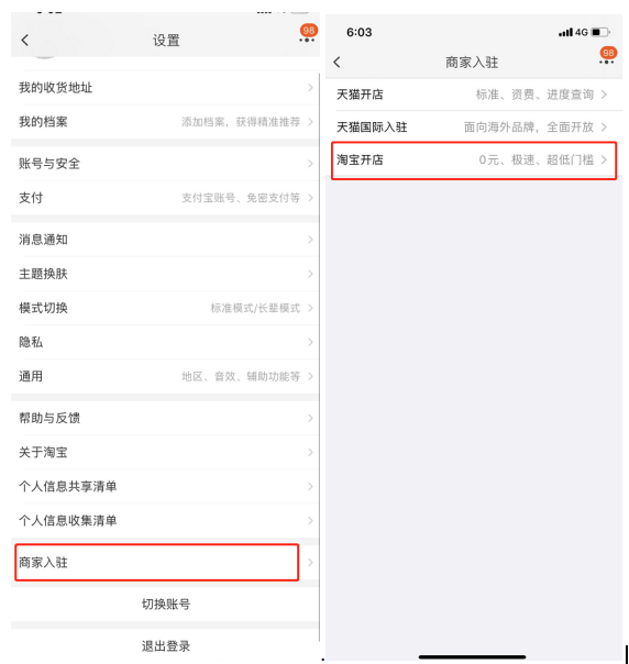 第二步:點(diǎn)擊商家入駐,點(diǎn)擊淘寶開店