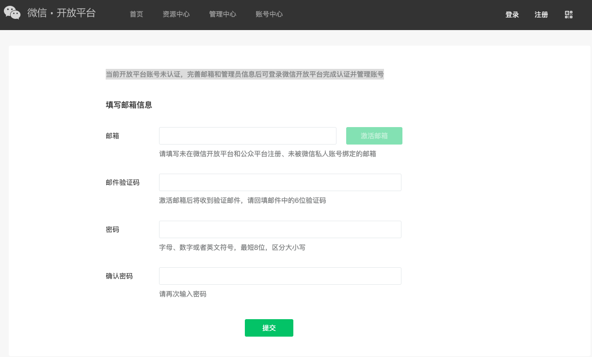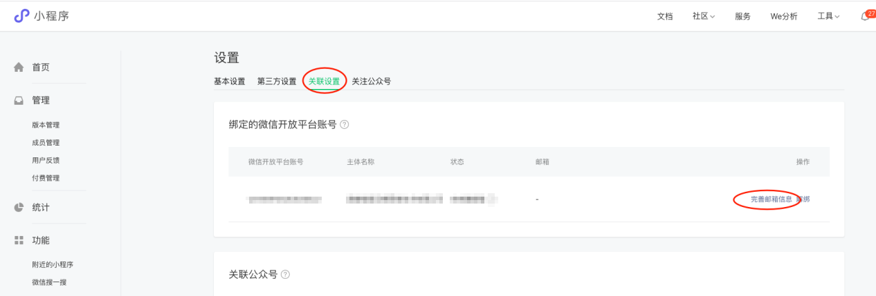 1.登錄小程序后臺小程序后臺設置》關聯(lián)設置》綁定的微信開放平臺賬號通過完善郵箱信息創(chuàng)建開放平臺并進行開放平臺認證。