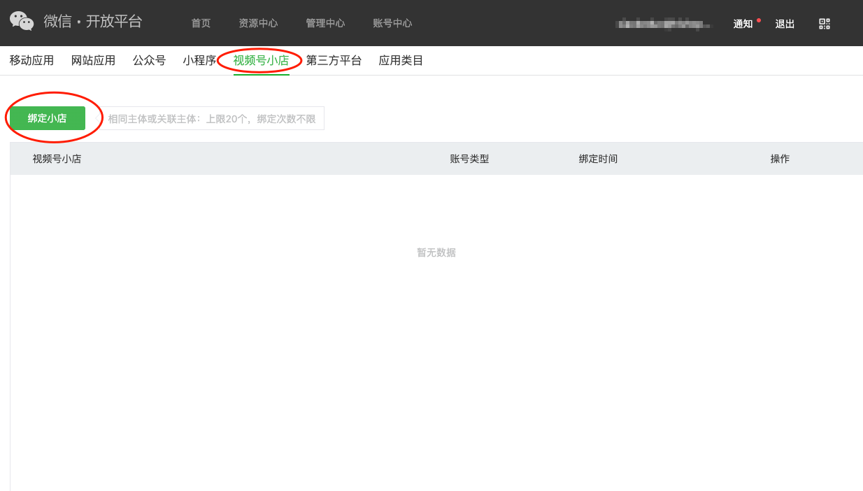 3.開放平臺認證通過后通過網(wǎng)址:https://open.weixin.qq.com/ 進行登錄,登錄成功后選擇視頻號小店,進行小店的綁定操作
