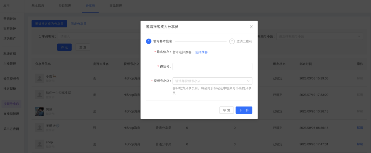 7.2添加普通分享員,選擇系統(tǒng)推客,填寫會員微信號,選擇關聯(lián)的視頻號小店。
