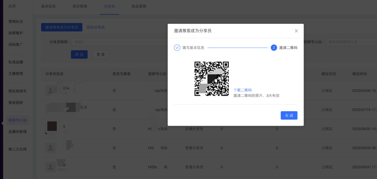 點擊下一步,生成邀請二維碼,下載邀請二維碼,發(fā)送給客戶,客戶微信掃碼確認,即可成為店鋪分享員