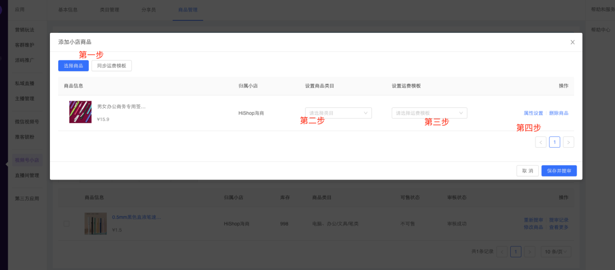 8.1視頻號小店》商品管理》添加小店商品》選擇商品。 選擇商品后,需要設置商品的類目,設置運費模板及商品屬性,所以信息設置完成,保存并提審。