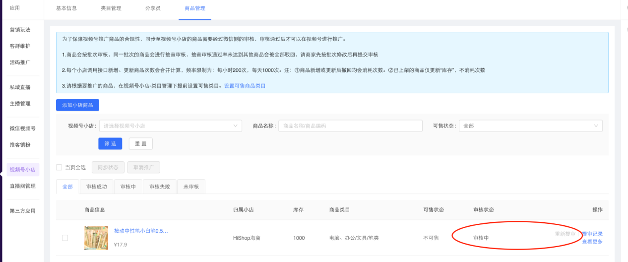 8.2此時商品處于審核中狀態(tài),待微信審核通過后,該商品即可在視頻號小店售賣