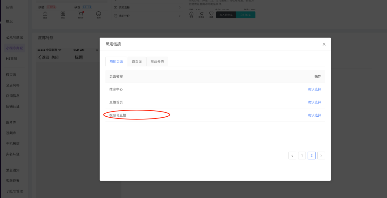 4.視頻號小店綁定成功后,登錄商城后臺,選擇菜單應用》視頻號小店,進行小店的接入操作