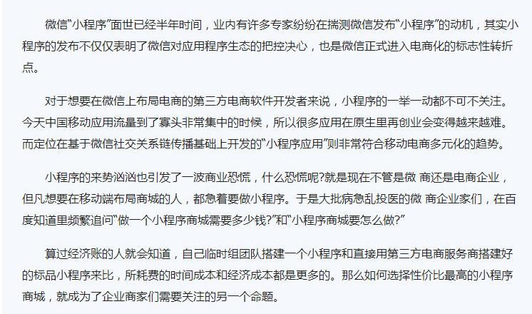 算過(guò)經(jīng)濟(jì)賬的人就會(huì)知道,自己臨時(shí)組團(tuán)隊(duì)搭建一個(gè)小程序和直接用第三方電商服務(wù)商搭建好的標(biāo)品小程序來(lái)比,所耗費(fèi)的時(shí)間成本和經(jīng)濟(jì)成本都是更多的。那么如何選擇性價(jià)比最高的小程序商城,就成為了企業(yè)商家們需要關(guān)注的另一個(gè)命題。